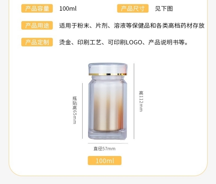 滄州明潔生產(chǎn)銷售新款保健品瓶,100ml漸變色瓶,膠囊瓶,內(nèi)膽亞克力瓶,軟膠囊瓶,亞克力瓶,壓片糖果瓶,藥片膠囊瓶,保健品塑料瓶,中藥丸瓶,避光塑料瓶,ps保健品瓶,固體片劑瓶,塑料藥瓶,產(chǎn)品規(guī)格多,外觀新穎,彰顯大氣。