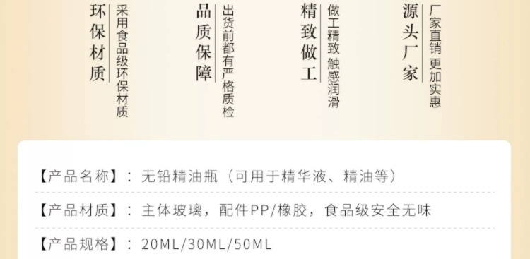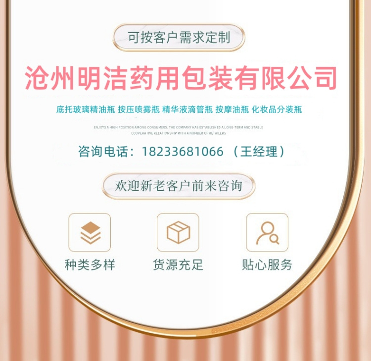 滄州明潔專注于底托玻璃精油瓶,精華液滴管瓶、按摩油底托瓶、化妝品分裝瓶、避光精油瓶、化妝品分裝瓶、精華液瓶、香水瓶、乳液瓶、膏霜瓶、眼霜瓶、面霜瓶、香薰瓶、面膜瓶、滴管瓶等,提供蒙砂、真空電鍍、噴涂、絲印、高溫、燙金燙銀等加工服務(wù)。