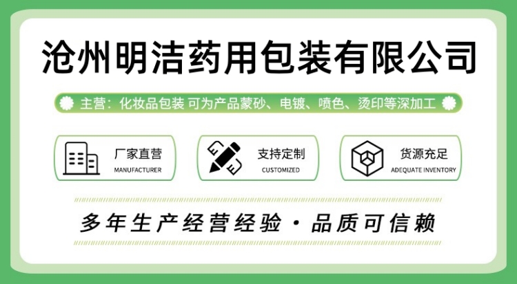 滄州明潔專注于方形精油瓶,按壓噴霧瓶、玻璃滴管瓶、化妝品分裝瓶、避光精油瓶、精華液瓶、香水瓶、乳液瓶、膏霜瓶、眼霜瓶、面霜瓶、香薰瓶、面膜瓶、滴管瓶等,提供蒙砂、真空電鍍、噴涂、絲印、高溫、燙金燙銀等加工服務。