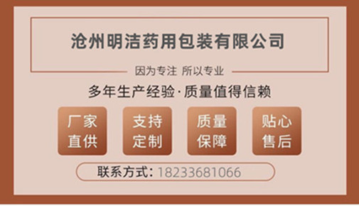 公司名稱:滄州明潔藥用包裝有限公司 公司地址:河北省滄州市運河區(qū)北京路天成財富中心801-804 電話:0317-5693789 5693277 5693256 傳真:0317-5693789