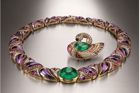 在上世紀中后期,大膽的彩色寶石鑲嵌成為了寶格麗的特色。造型尊貴華麗,具有厚重感。紫紅色寶石以斜邊幾何圖形嚴絲合縫地銜接起來,以鉆石作為鑲邊,弧面祖母綠寶石有著_的通透度,重達41克拉以上,成為_的代名詞。它和一顆相同配額色的天鵝胸針是配套,打造從顏色炫彩的_項鏈。