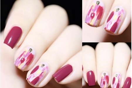 桃紅色和絳紫色的水彩指甲頗有古典感,用黃色和粉色做底層的暈染,絳紫色將在上層點綴,以小鉆作為裝飾,這個甲面華麗多彩,層次感明顯,而且也不會顯得復雜。