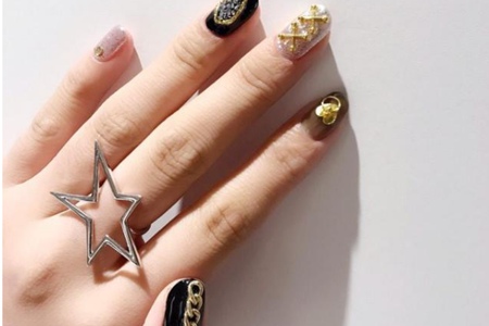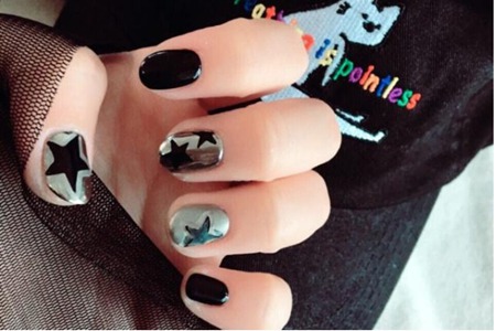 藍灰色的鏡面帶來夢幻的感覺,星星占據了大半的指甲,在周圍畫出勾邊會讓星星有浮起來的感覺,形狀變得更加有層次感。黑色和藍色的搭配沉穩又霸氣,具有cool girl的感覺。