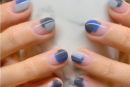 法式美甲只涂抹前半部分的指甲,用灰色、寶藍色、墨藍色來作為層次的疊加。涂出平整的邊緣,打造出扇形形狀,用另外一種顏色疊加,可以有更加時尚的效果。這_法式更為潮流,充滿前衛(wèi)感的幾何圖形具有棱角,邊界變得不規(guī)整。