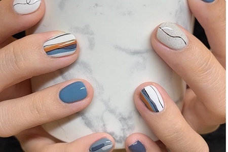 具有北歐性冷淡風(fēng)的美甲_耐看,用色低調(diào),莫蘭蒂成為主色調(diào),顏色搭配讓人感覺到舒服。彎曲的線條打造簡潔的審美,在白藍色中以一抹亮眼橘色調(diào)動活力。曲線可以打造出多種造型,在兩側(cè)增加方形,在中間纏繞上小結(jié)。磨砂質(zhì)感的灰色小點甲油,如同大理石的質(zhì)感,為指甲增添上北歐風(fēng)情。