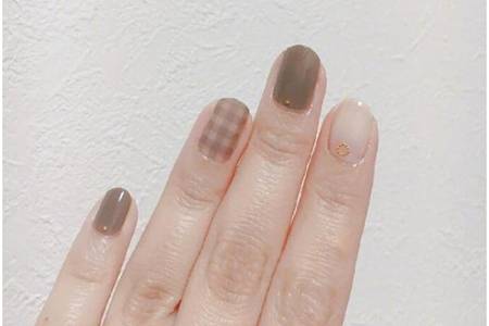 棕灰色是一種很白的顏色,深色的美甲和冬天的穿搭更適合,不會(huì)有厚重的感覺(jué),反而覺(jué)得雅致。將灰棕色和白色調(diào)和混成淺色,打造出純色的美甲。添加格紋元素,透明的格子和灰粽色相間。添上一層透明甲油,能夠讓指甲看起來(lái)更加通透。