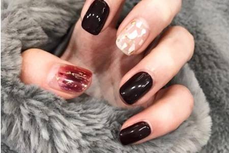 黑色的指甲搭配白色透明的貝殼,在造型上變得活潑,溫柔的女生也能夠駕馭的黑色美甲款式。將貝殼片分開黏貼在透明的指甲上,_后用光澤感透明甲油涂抹在指甲上。